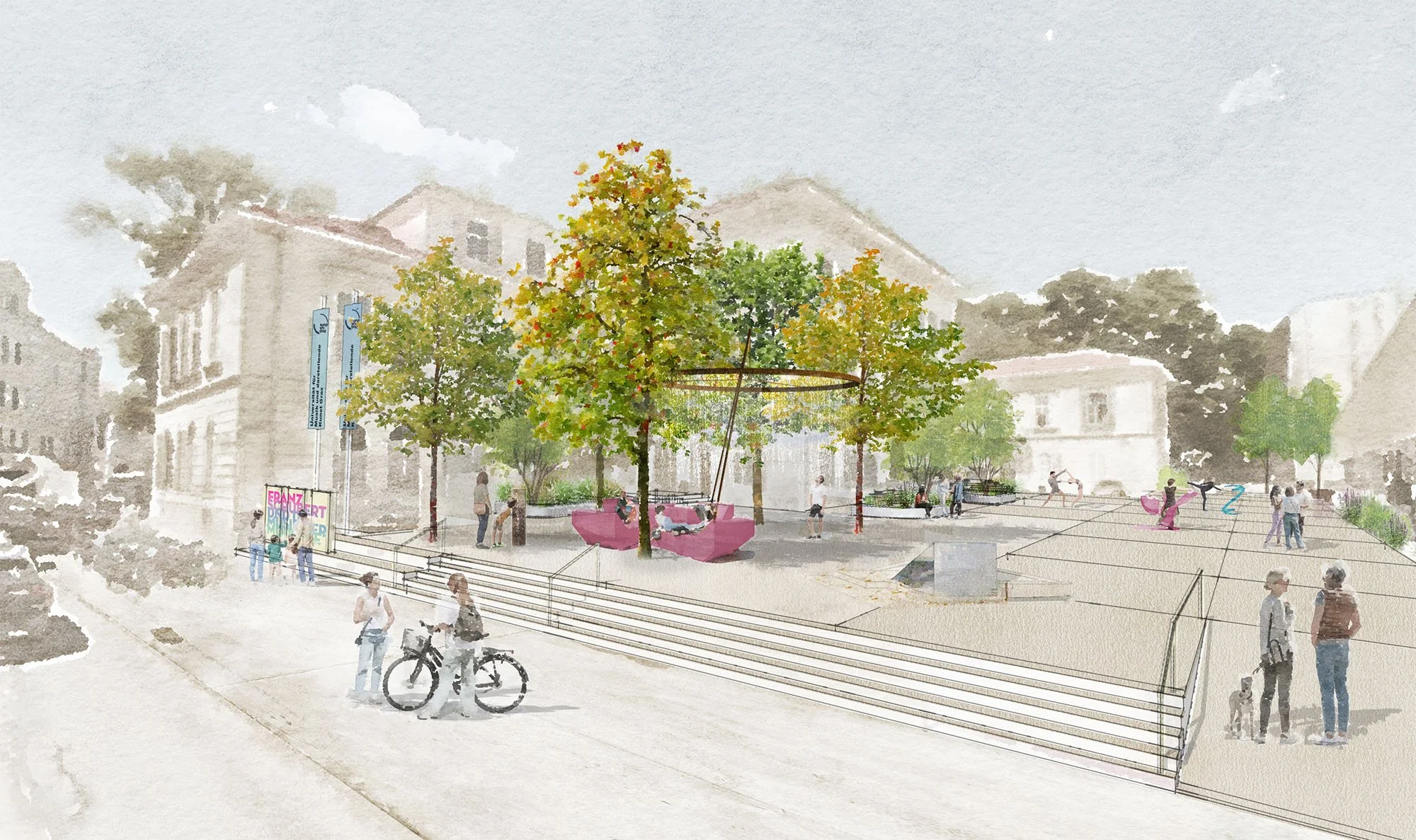 Our proposal focuses on the needs of the university’s diverse user groups, creating an inclusive and flexible public space for students, staff, and visitors. The design strengthens the university’s public presence, enhances biodiversity, and ensures thermal comfort during the hot summer months through tree planting and cooling water elements.